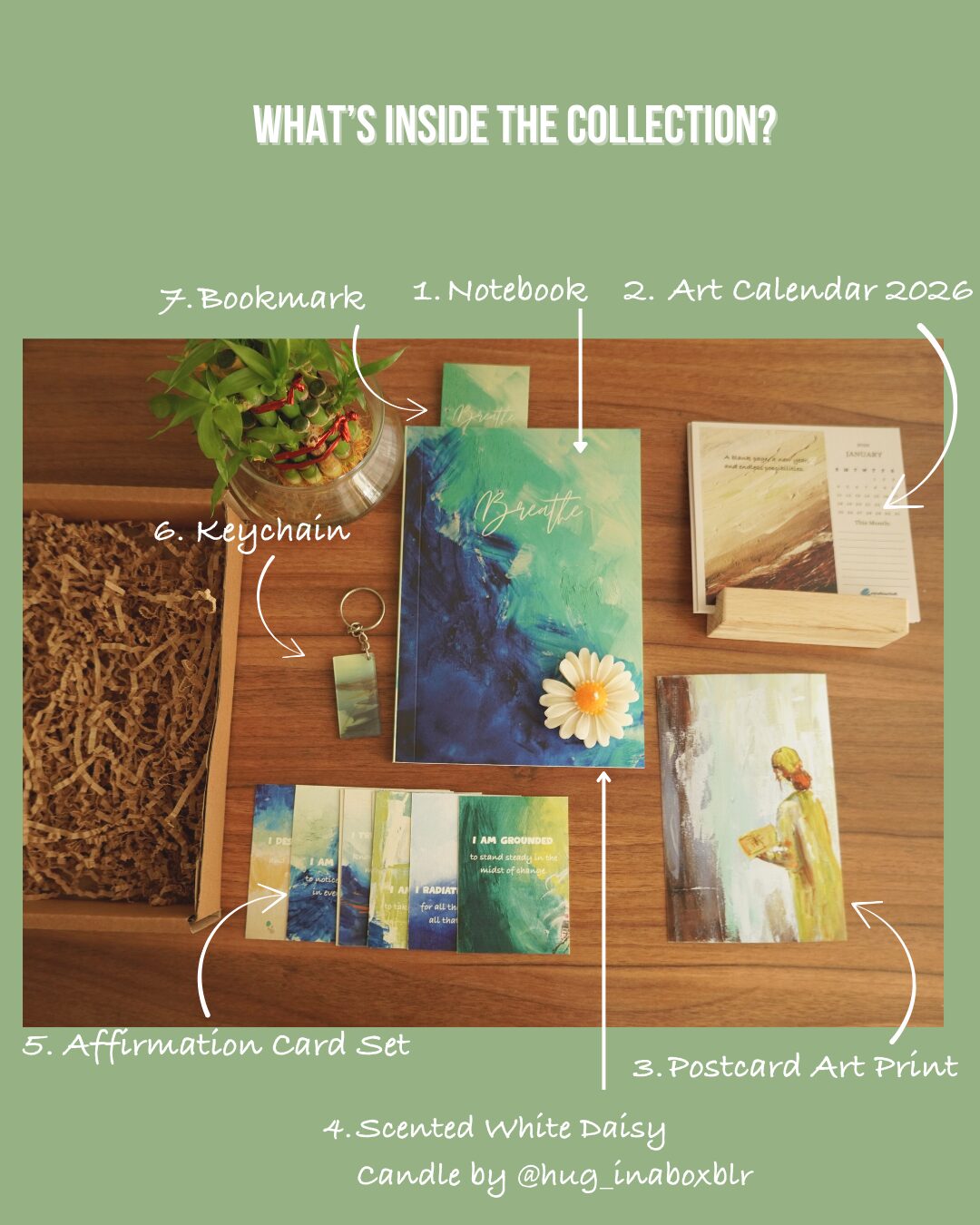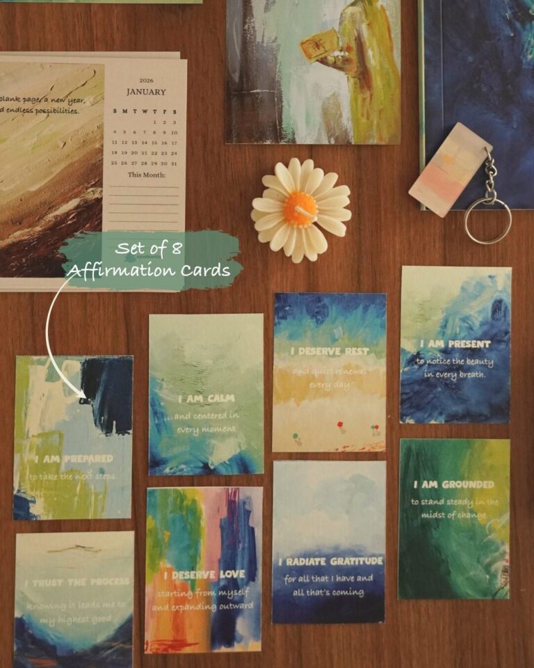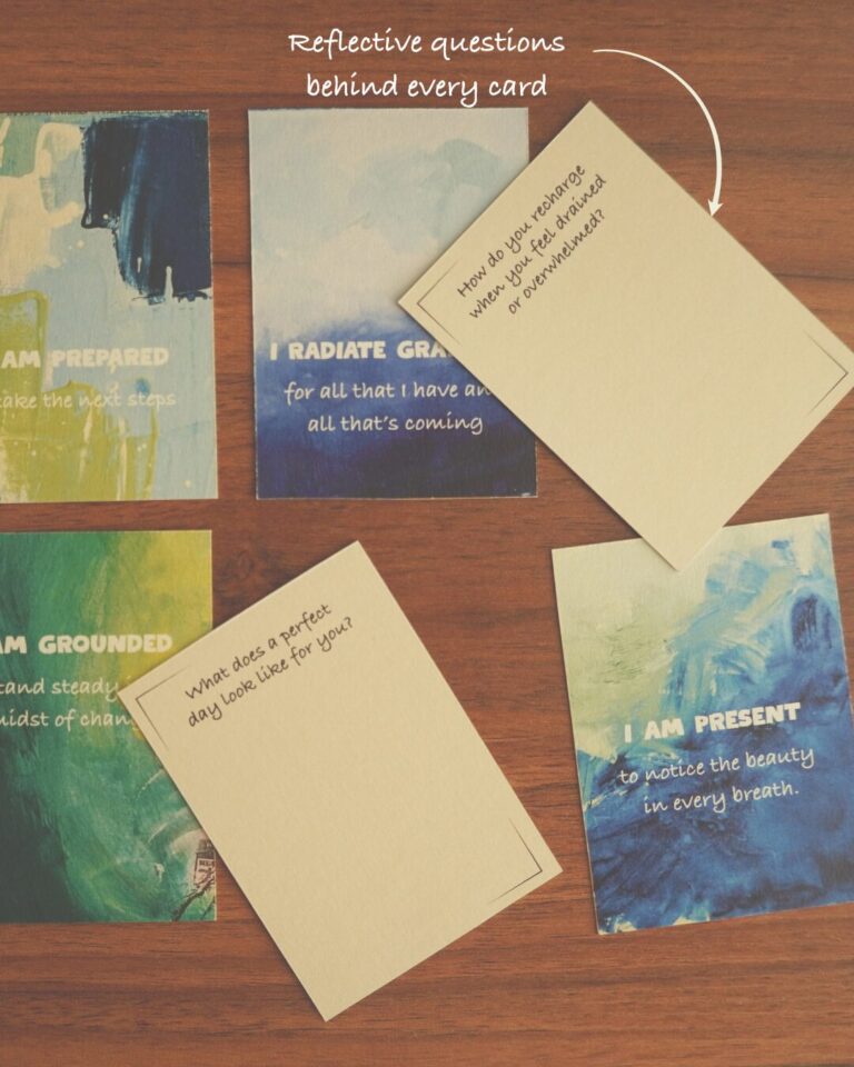 * 8 Affirmation Cards (art front, reflective questions back)