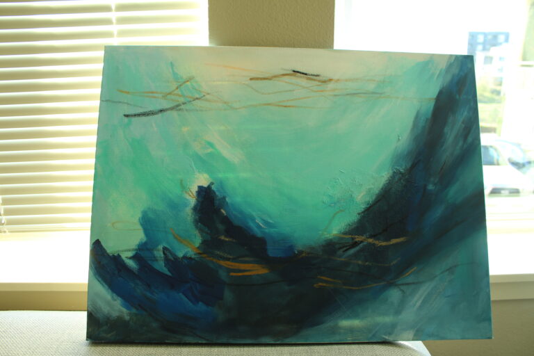 Bold strokes of acrylic mimic the playful splash of ocean waves, their vibrant blues and greens swirling with a hint of frothy white. Textured elements, reminiscent of coral reefs and sun-dappled seaweed, add depth and intrigue to the composition. But beneath the playful dance lies a deeper peace: As your gaze travels inward, the colors soften, transitioning to calming hues. Smooth washes of paint evoke the stillness of the ocean depths, a place of quiet majesty where sunlight filters through.